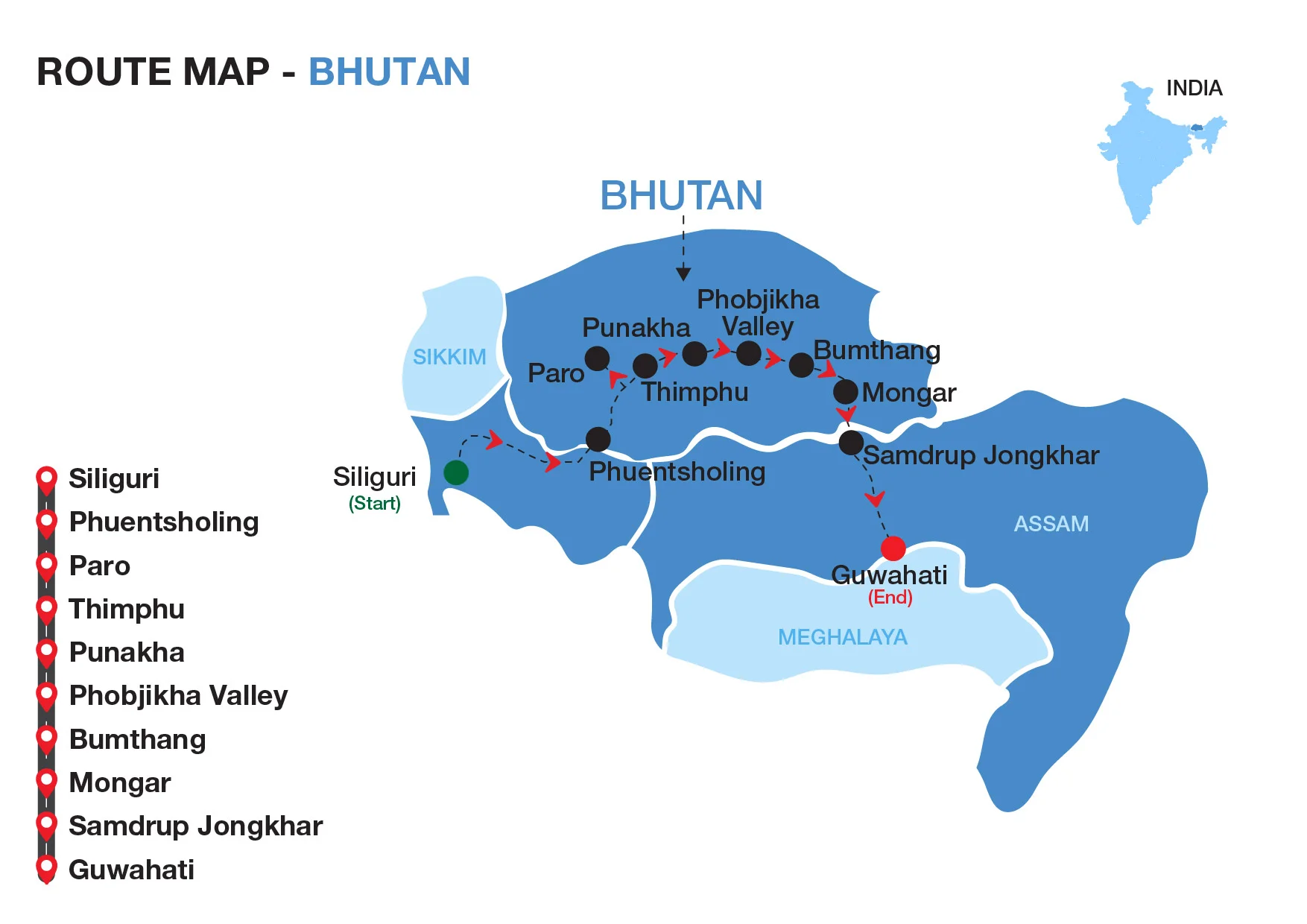 The last great Himalayan Kingdom, cloaked in an aura of mystery and blessed with immense natural beauty, Bhutan is a delightful revelation. Devoted to sustainable tourism practices, the Bhutanese are proud of their humane approach that lays more stress on happiness and well-being of its inhabitants as well as visitors. A road trip through Bhutan will introduce you to a world that wears both its mantles with ease; one of traditional Buddhist cultural values, and another that welcomes contemporary development with open arms. Crossing the border to Bhutan from Siliguri in West Bengal, our sojourn into the ‘Land of the Thunder Dragon’, will begin in Phuentsholing and take us to Paro, Thimphu, Punakha, Phobjikha Valley, Bumthang, Mongar and Samdrup Jongkhar before crossing back into India via the city of Guwahati in Assam.