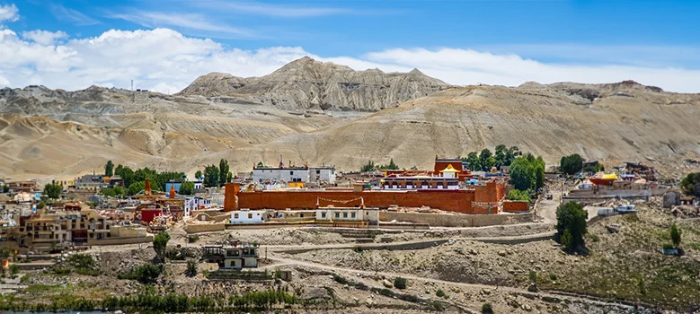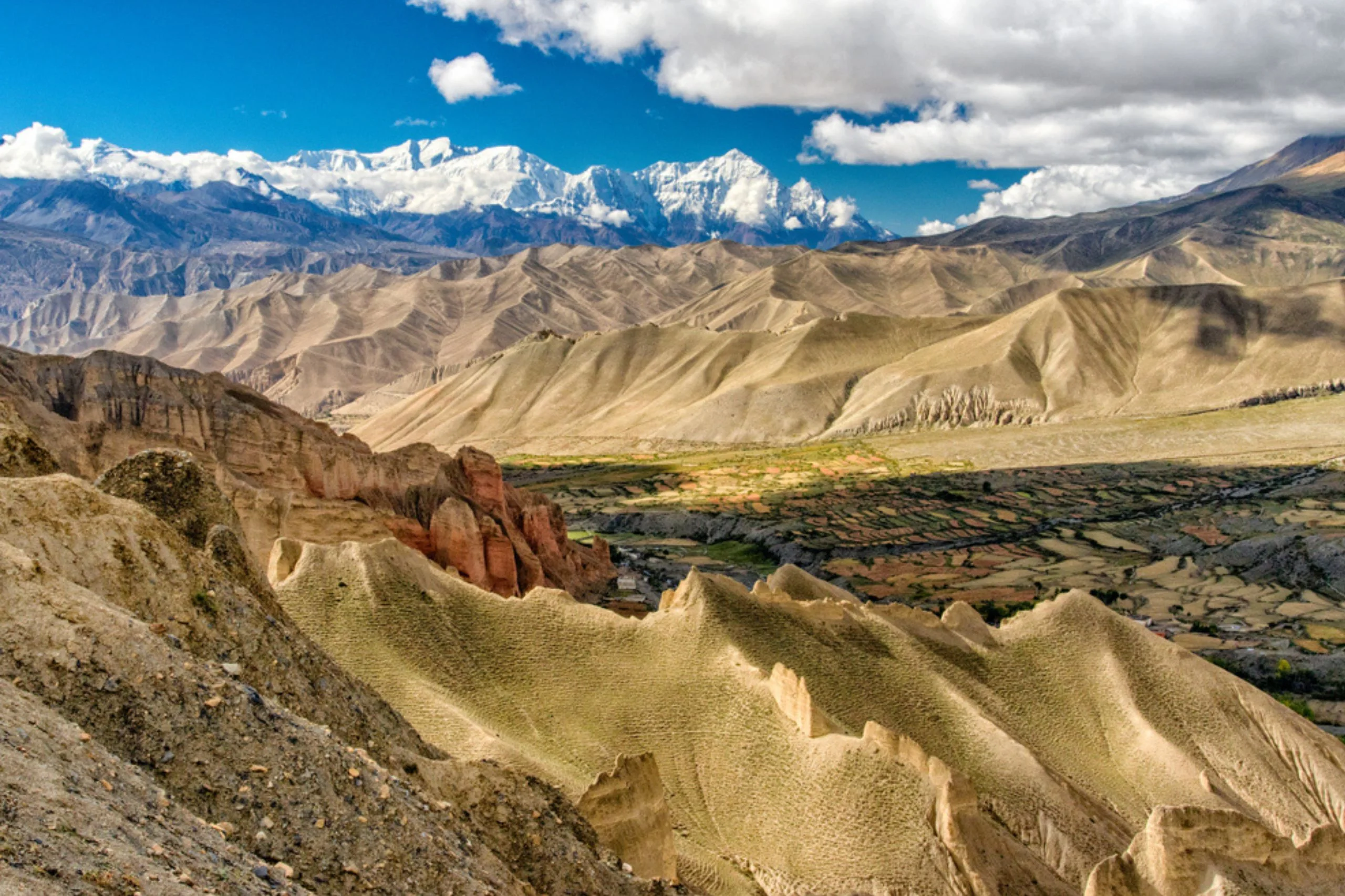 Mustang Valley features rugged mountainous terrain with narrow, winding roads and high altitude passes. Road conditions can vary from well-paved highways to gravel tracks and dirt roads.